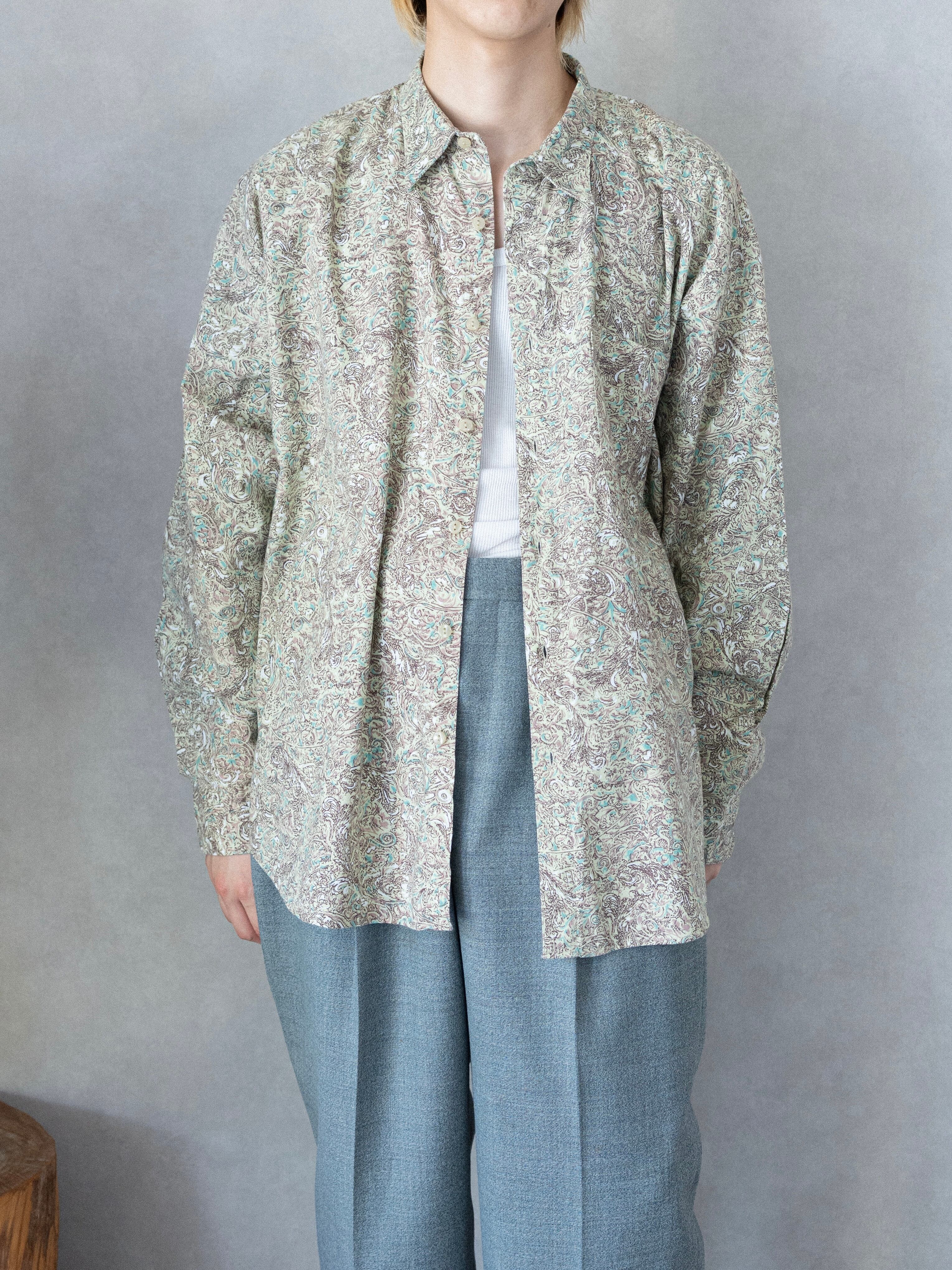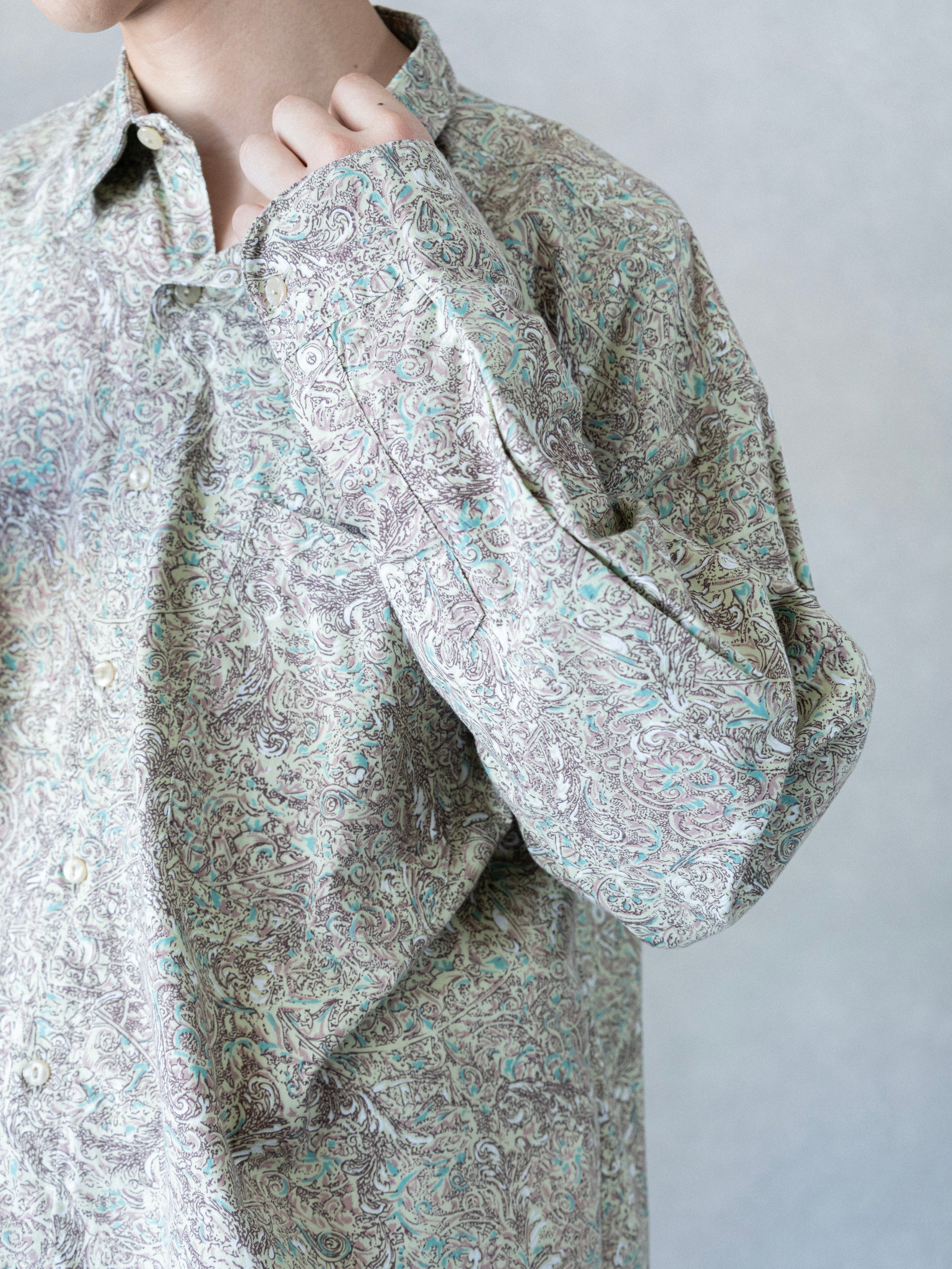 ベージュを基調にグリーンを多用したペイズリー柄は、派手な印象もあるが、シャツ全体の品の良さがうまくまとめている。